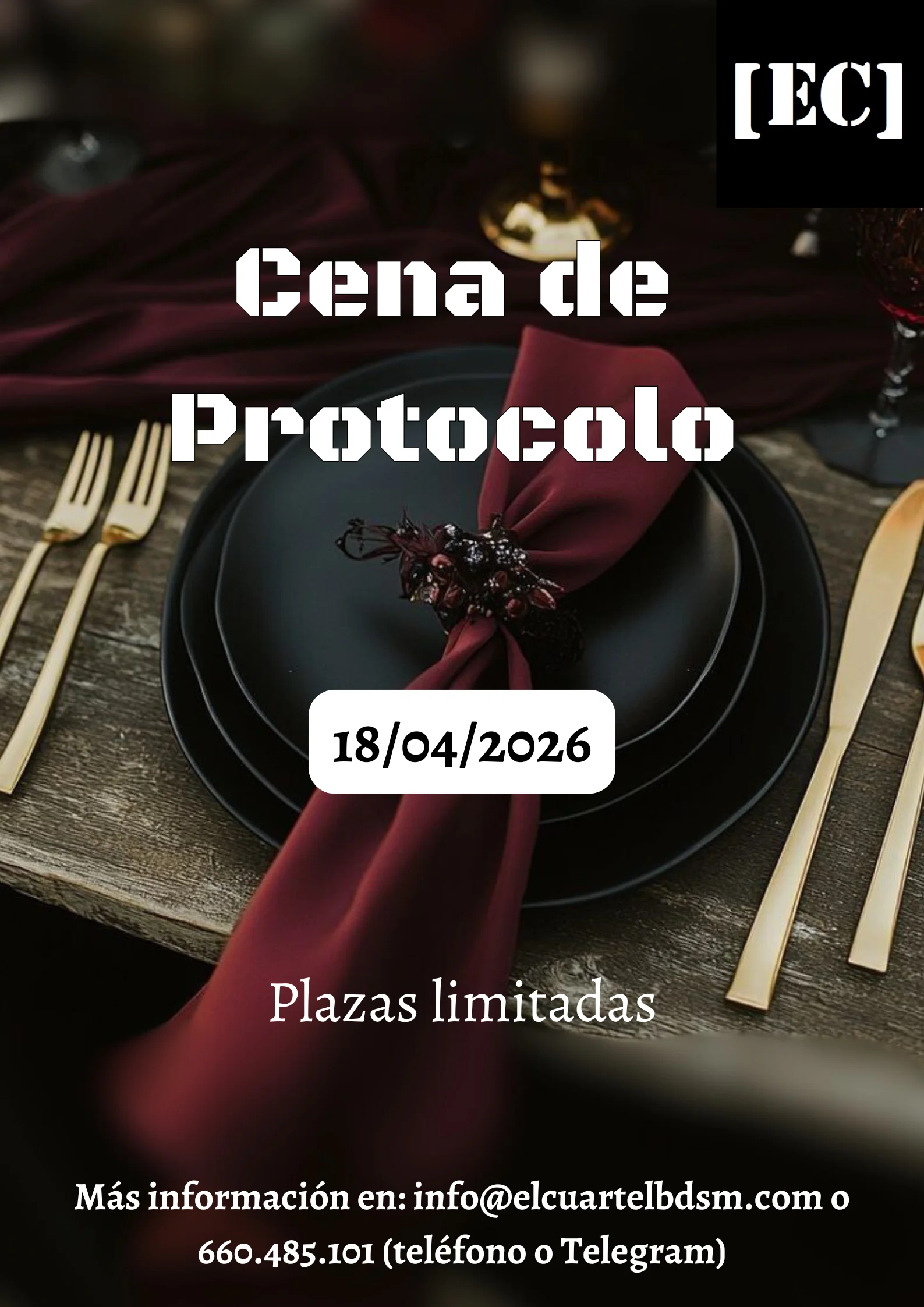 Programa: Sábado 18/04/2026 17h: Apertura de puertas para sumisos 18h: Taller Recordatorio de Protocolo de Servicio (para sumisos) 20h: Apertura de puertas y Acceso a la Cantina para Dominantes 20:30h: Cierre de acceso (Todos los invitados deberán llegar antes) 21h: Taller Recordatorio de Protocolo de Mesa (para Dominantes) 22h: Cena […]