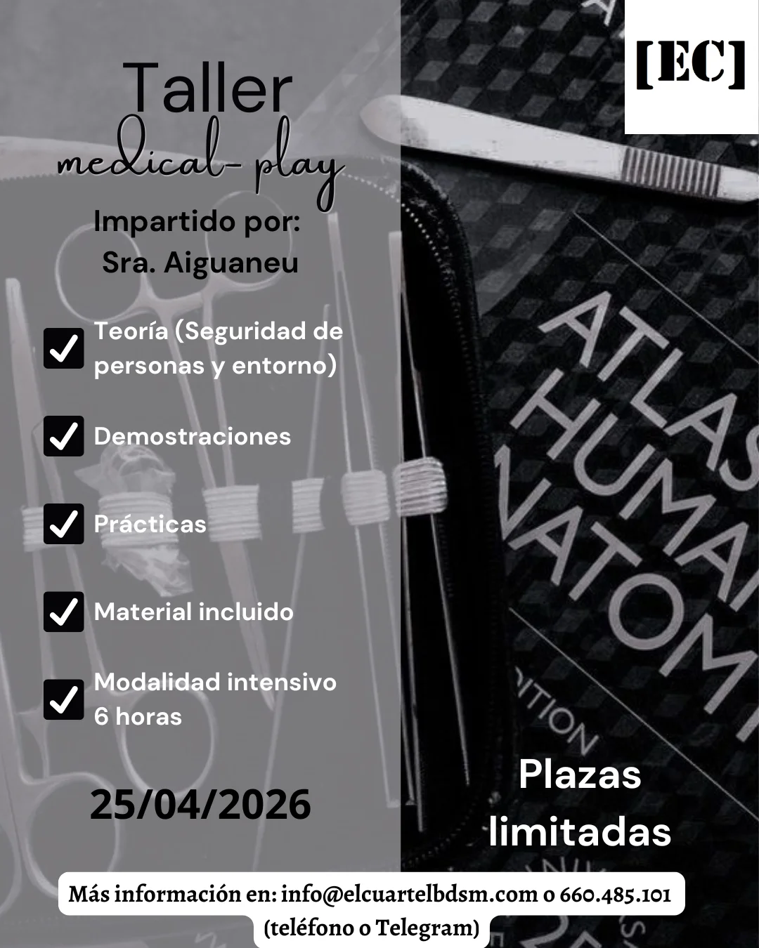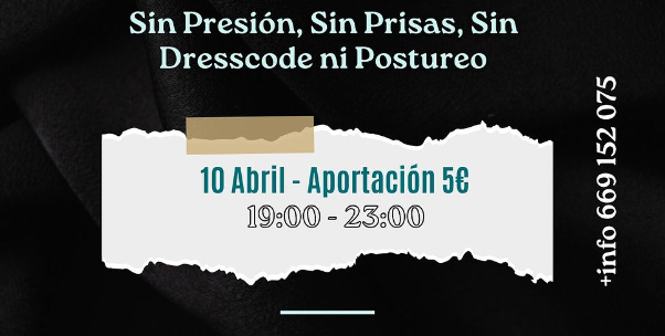 Programa: Sábado 25/04/2026 17h: Apertura de puertas 17:30h: Taller (Parte teórica) 20:30h: Pausa para cenar (la cena no se realizará en el local) 22h: Apertura de puertas tras la cena 22:30h-04:00h: Taller (Parte práctica) Aportación: 65€/persona que acuda sola 80€/binomio Descuento de 5€ para socios. Se incluye bebidas no alcohólicas […]
