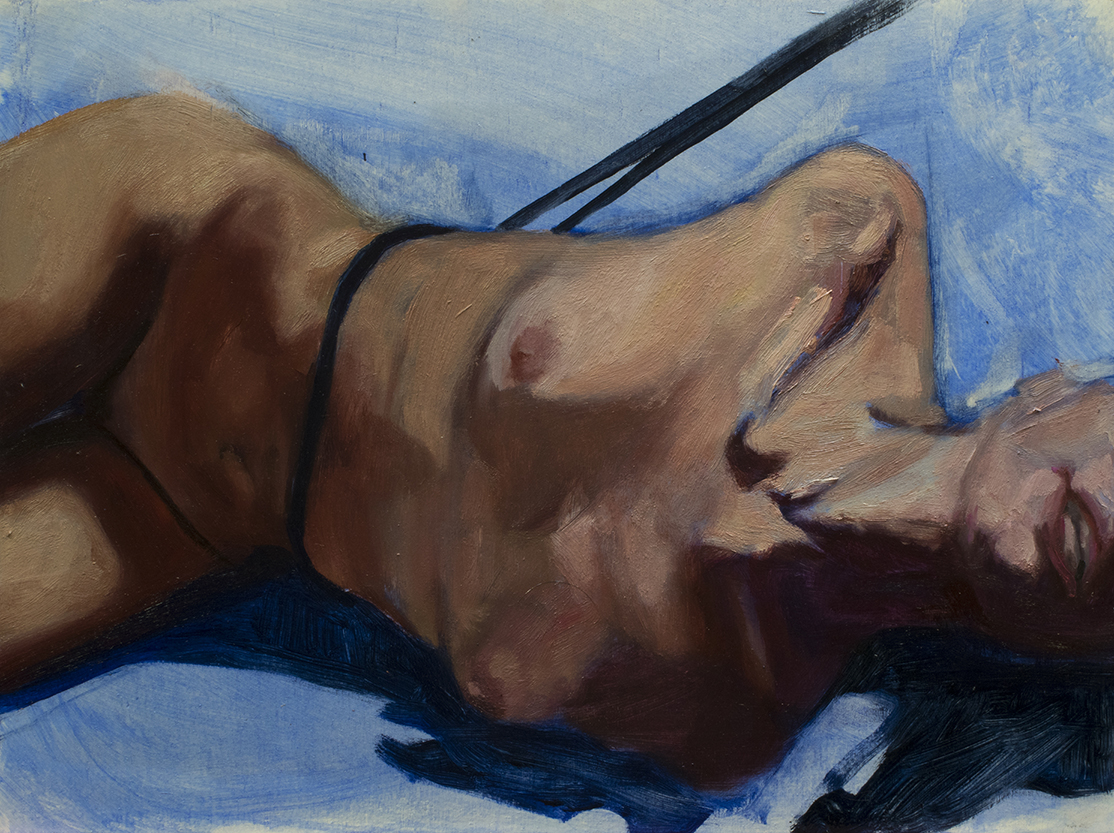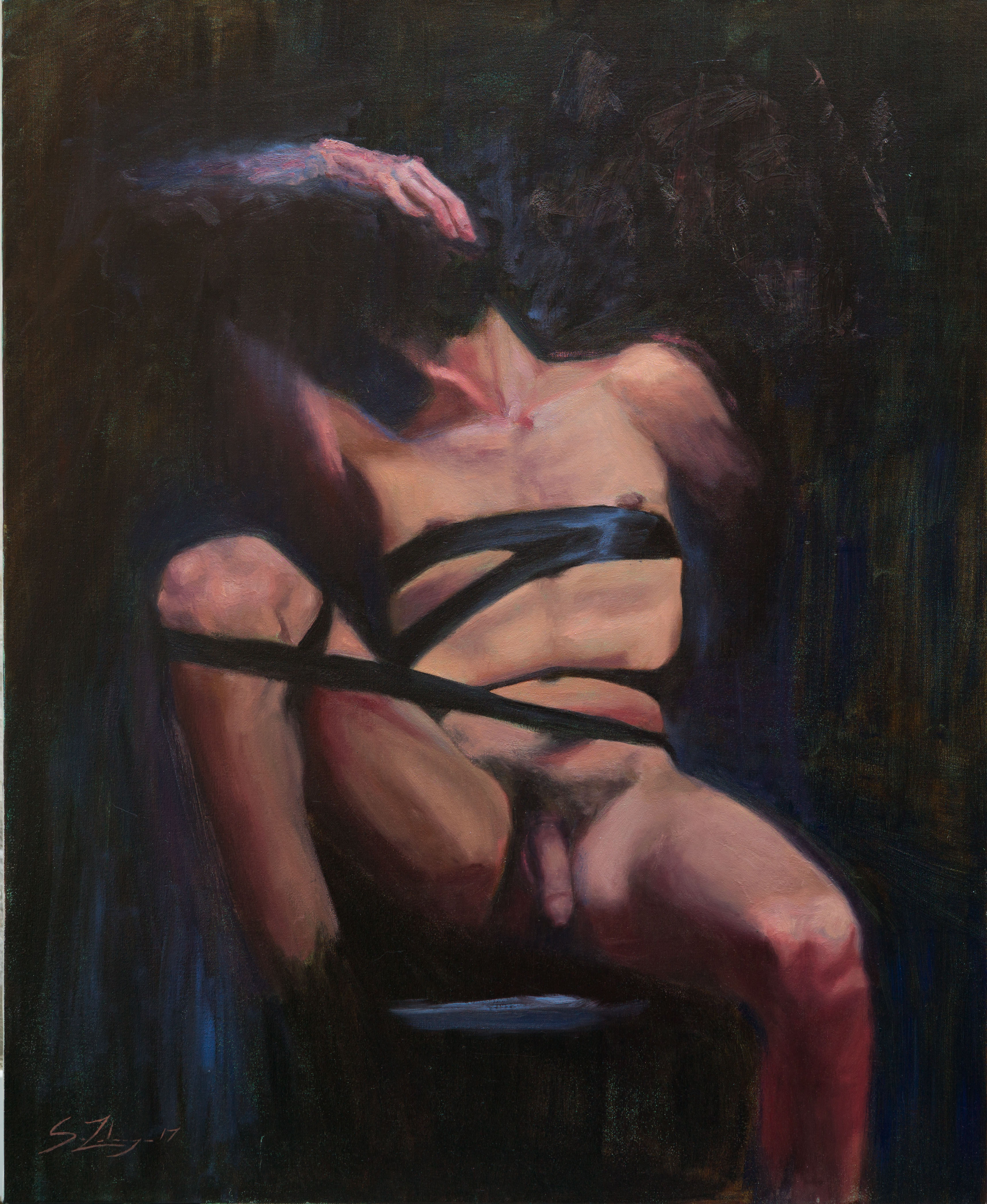 Esto fue muy simple, un verano no tenía modelos porque estaban todos de vacaciones y quería pintar y no sabía qué pintar y dije “¿si me pongo un gagball en la boca y me pinto?” Luego cogí cinta negra y me até y me pinté, que no es cosa fácil (jajaja risas) porque si sabéis con un gagball cuando estás en momentos íntimos no tienes tanta saliva como cuando te estás pintando, esto era ríos y ríos y ríos… Y tienes 2 o 3 espejos y no te puedes mover, entonces tienes un brazo que se mueve con los pinceles y el cuerpo lo tienes que mantener, si quieres ir a fumar, si quieres ir al baño… tienes que tratar de volverte a atar igual e interpretarlo. Fue un momento de desespero al no tener modelos y dije ¡pues lo hago yo!